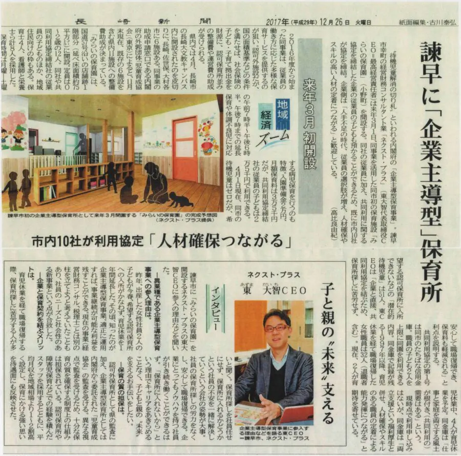 2017年12月26日の長崎新聞にみらいの保育園開設についての記事が掲載されました!