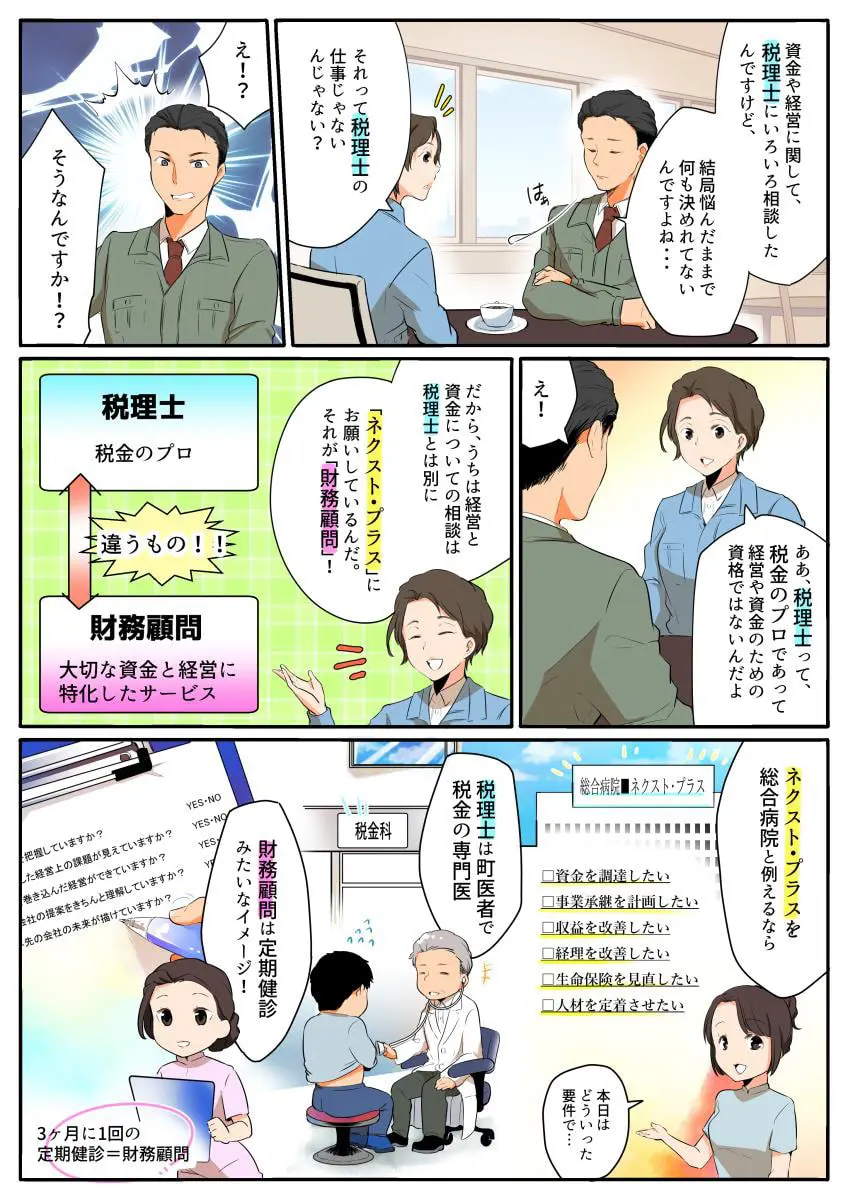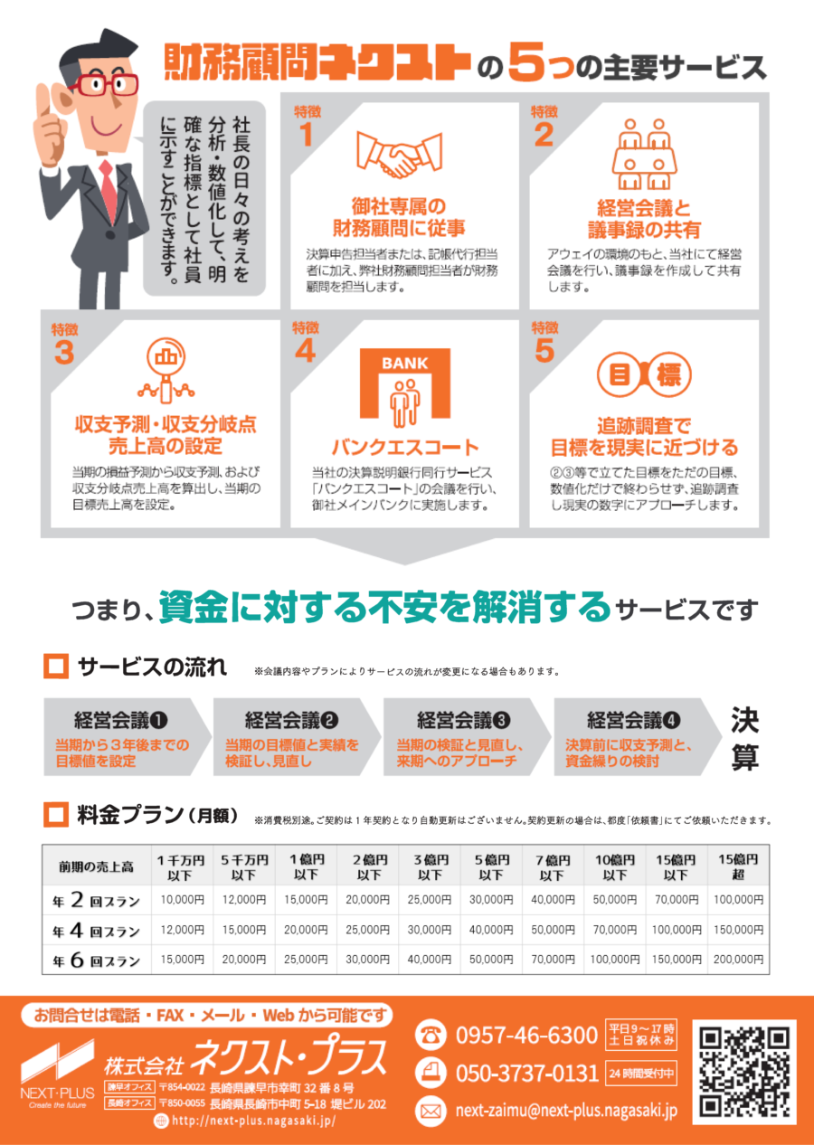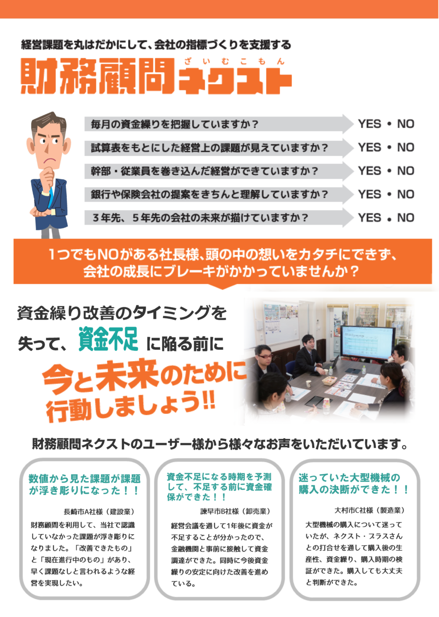 「財務顧問ネクスト」は、経営者の最良の相談相手となり、資金の不安を解消し、成長の後押しをするサービスです。